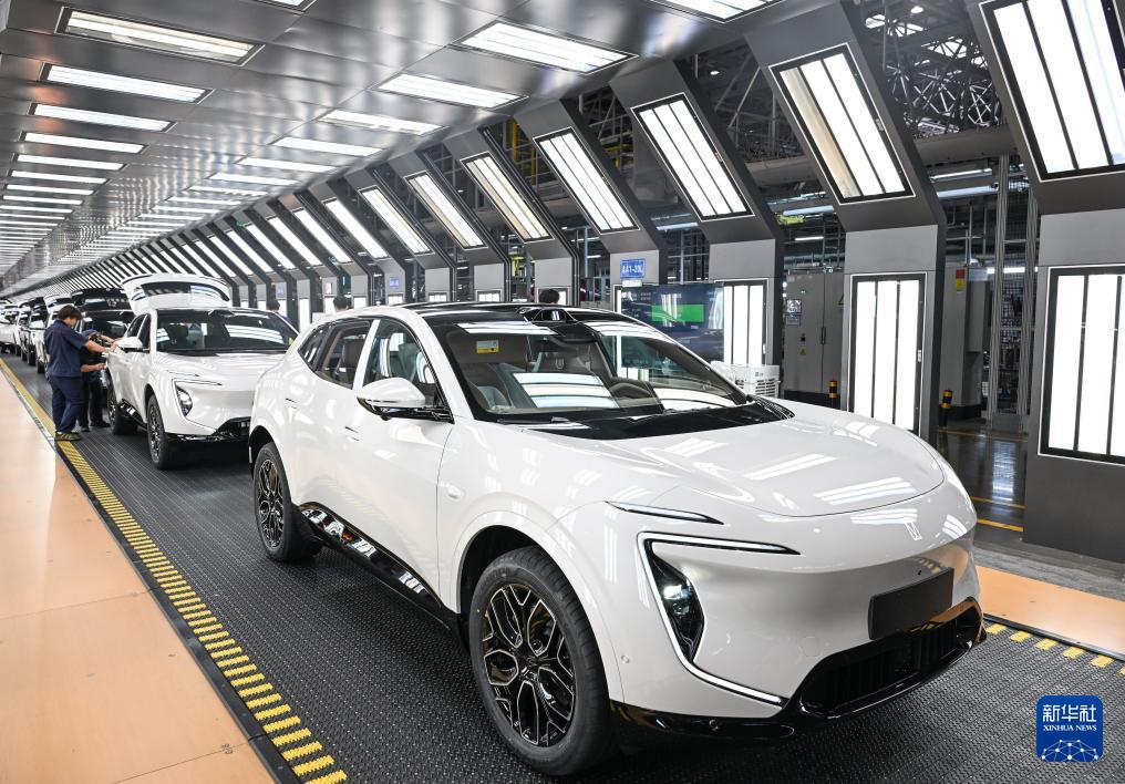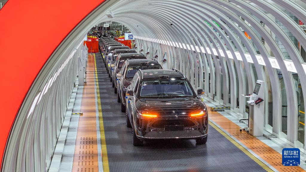 9月18日在位于重庆市渝北区的长安汽车数智工厂总装车间拍摄的即将下线的新能源汽车。