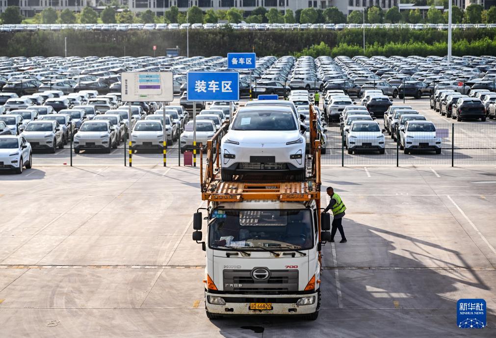 9月18日在位于重庆市渝北区的长安汽车数智工厂整车分拨中心拍摄的新能源汽车装车现场。