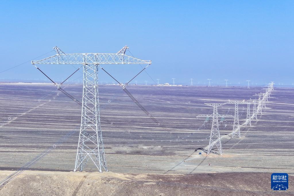 矗立在戈壁上的±800千伏哈密—重庆特高压直流输电线路工程(4月8日摄,无人机照片)。