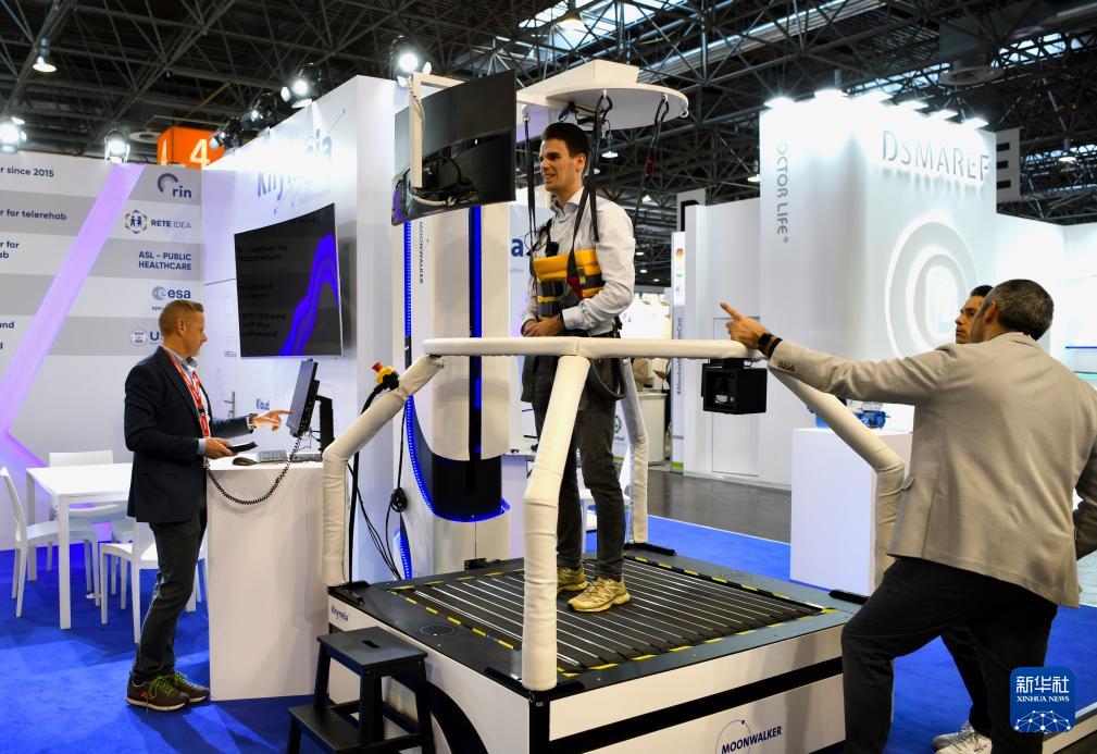 11月17日,一名参观者在德国杜塞尔多夫国际医疗器械设备展上体验康复设备。