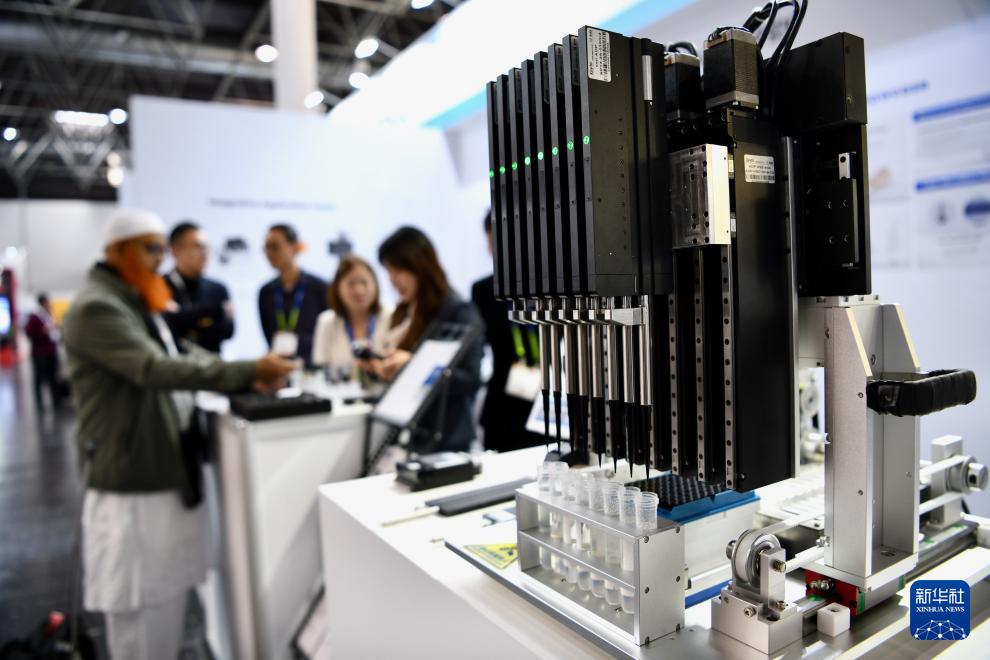 这是11月17日在德国杜塞尔多夫国际医疗器械设备展上拍摄的自动移液器。