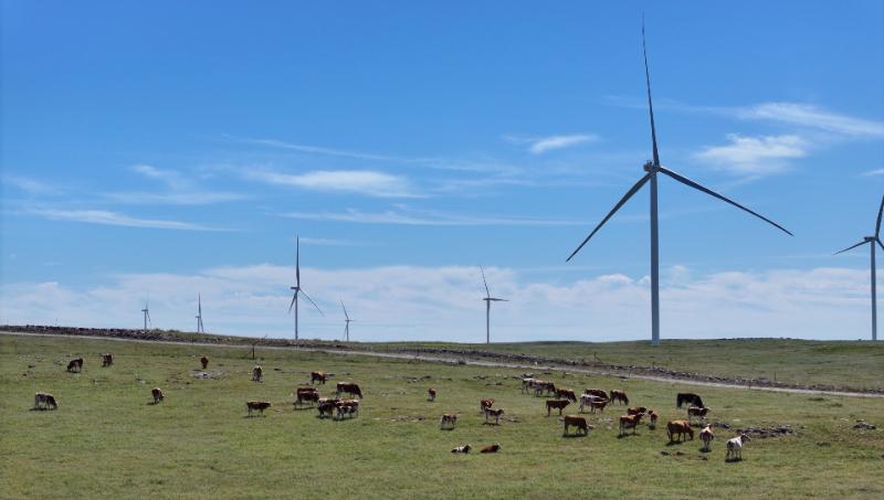 图为内蒙古锡林郭勒盟阿巴嘎旗,一排排风力发电机与草原构成一幅美丽画卷。新华网发(郭梓升 摄)
