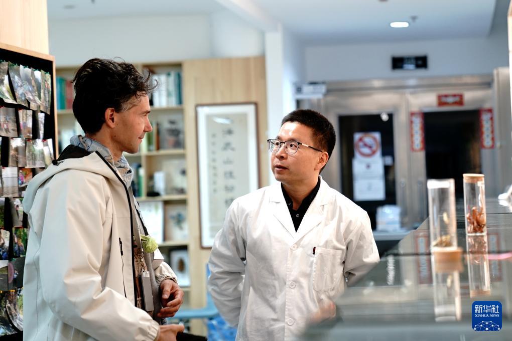 11月19日,上海辰山植物标本馆馆长葛斌杰(右)在辰山中心给一位外国艺术家介绍种子知识。