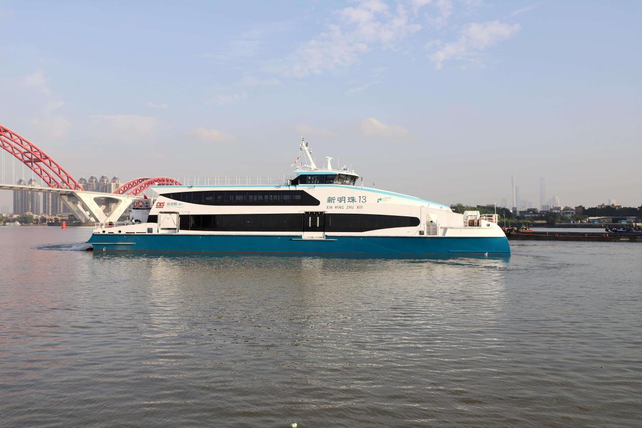 据悉,“新明珠13”号为铝合金500客位高速客渡船,总长44.9米,型宽11米,采用常规动力喷水推进,能在八级风海况中安全航行,设计航速26节。