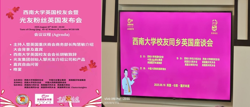 8月16日,光友粉丝团在伦敦重庆味道召开《西南大学英国校友会暨光友粉丝英国发布会》,来自中英两国的西南大学校友及川渝云贵等企业家、科学家欢聚一堂,共叙乡情、推动光友粉丝在英国大发展。