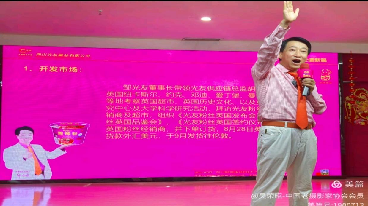 邹光友在会上演讲《粉丝让人生更精彩》,粉丝如何让人生更精彩?怎样打造自己的金饭碗?从以下几方面做起:成功心态万事成、辞官下海卖红薯、管理模式共分享、人生精彩粉丝路,震惊全场。