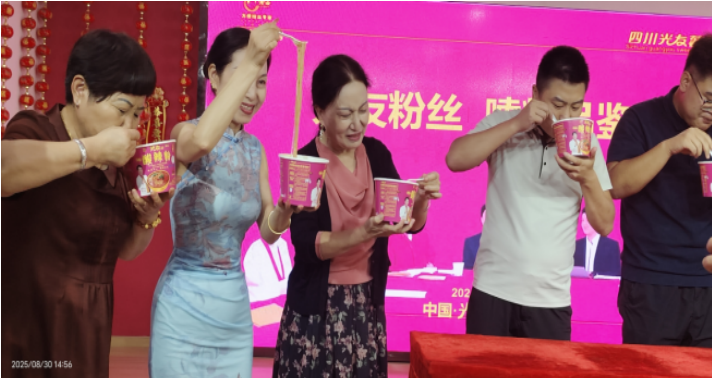 “嗦粉大赛,现在开启!”主持人话音刚落,数十名参赛嘉宾迅速上场,面前摆放着光友低Gi酸辣粉;台下嘉宾席,工作人员同步端上光友酸辣粉mini杯,台上台下形成“同步嗦粉”的热闹场景。哨声响起,台上选手专注角逐,有人用筷子高高挑起粉丝、有人用筷子快速卷粉入口、有人小口快咽确保汤汁不洒,全程严守“用时最短、碗底无汤”标准;台下嘉宾边品尝边关注比赛,偶尔与身旁人交流:“你试试这个酸辣粉,嚼着有红薯的绵甜”“酸辣粉的红油飘香”,轻声讨论与台上的细微吞咽声交织,氛围鲜活。