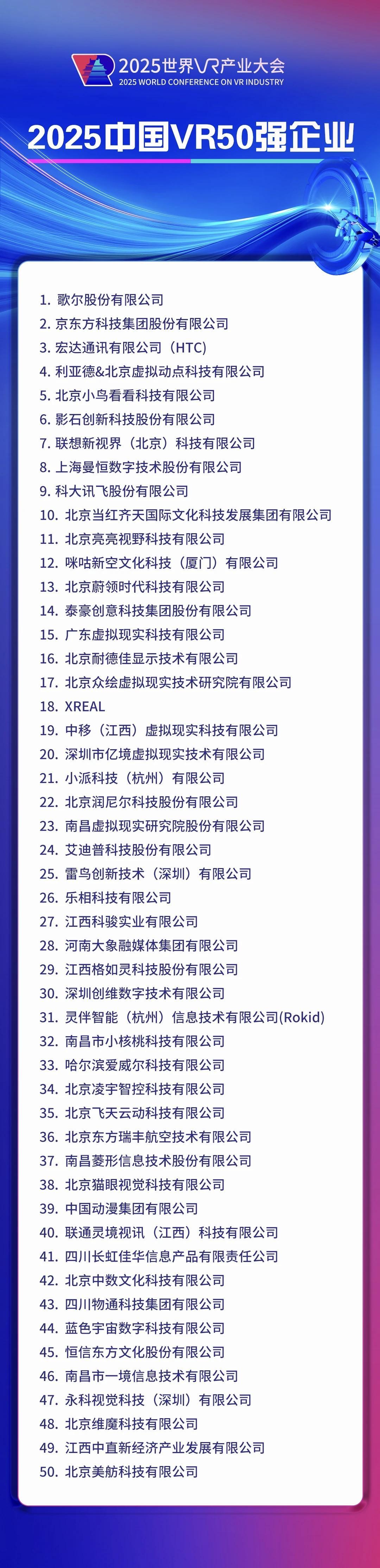 10月19日,“2025中国VR50强企业”名单正式发布,这是“中国VR50强企业”名单连续第七年发布。
