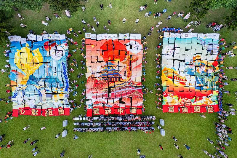 10月1日,在香港中山纪念公园,180余所学校的约千名师生家长共同拼出3幅巨型拼图:爱我中华、富强盛世、心系祖国。新华社发(受访者供图)