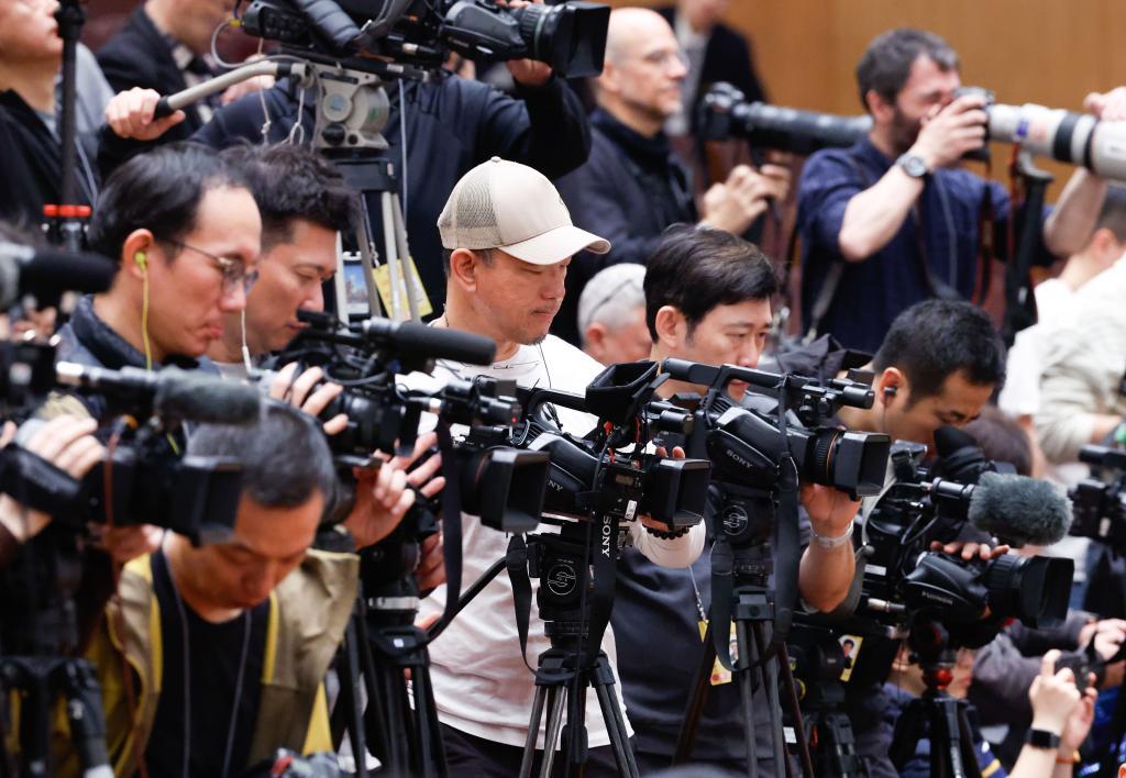 3月10日,全国政协十四届三次会议在北京人民大会堂举行闭幕会。这是记者在会场采访。