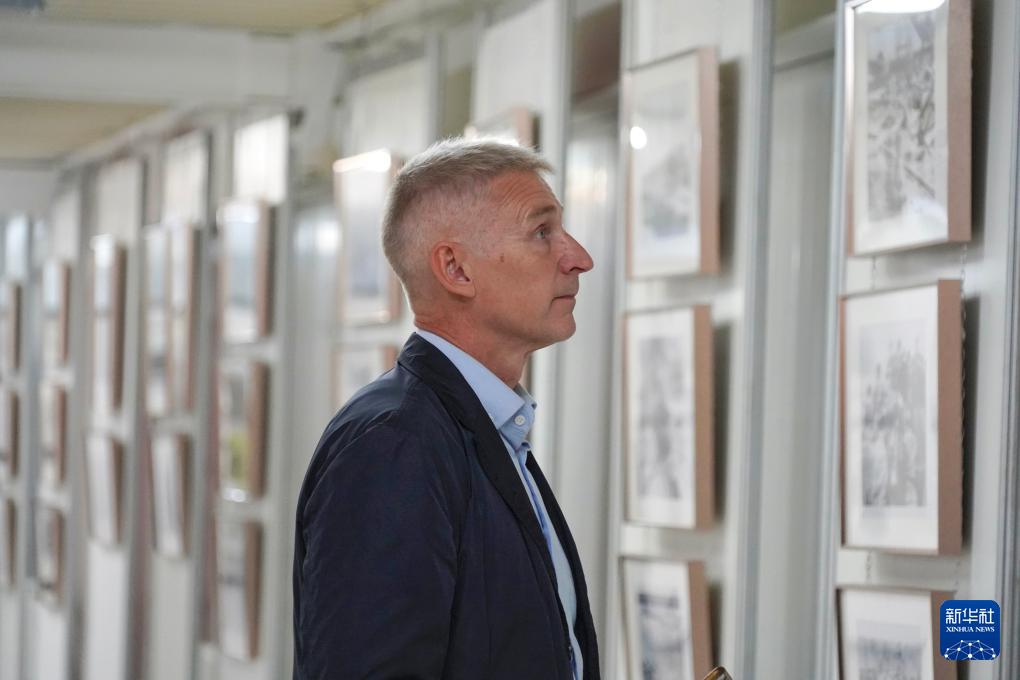 8月28日,在俄罗斯圣彼得堡,一名男子参观纪念中国人民抗日战争暨世界反法西斯战争胜利80周年图片展。新华社记者 周天翮 摄