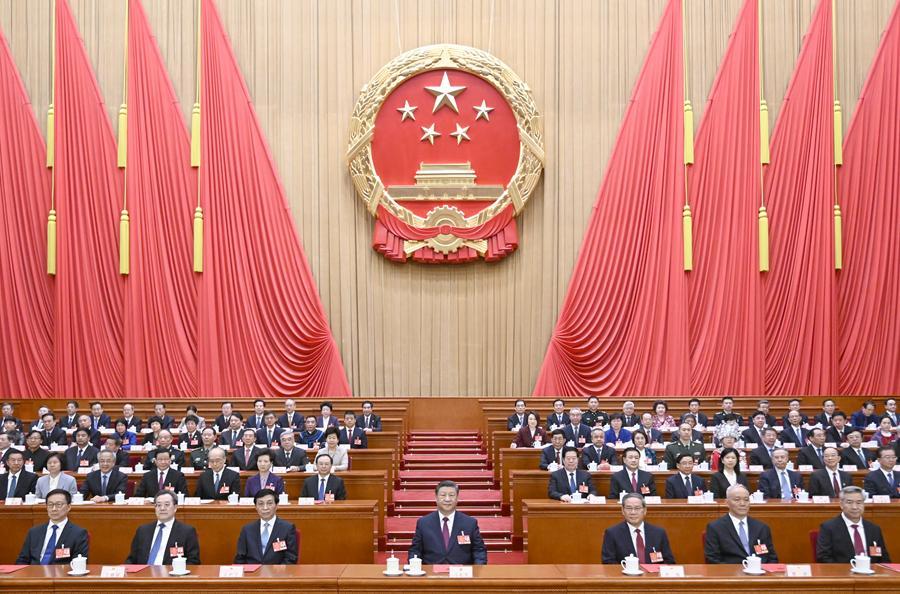 习近平、李强、王沪宁、蔡奇、丁薛祥、李希、韩正和大会主席团成员在主席台就座。