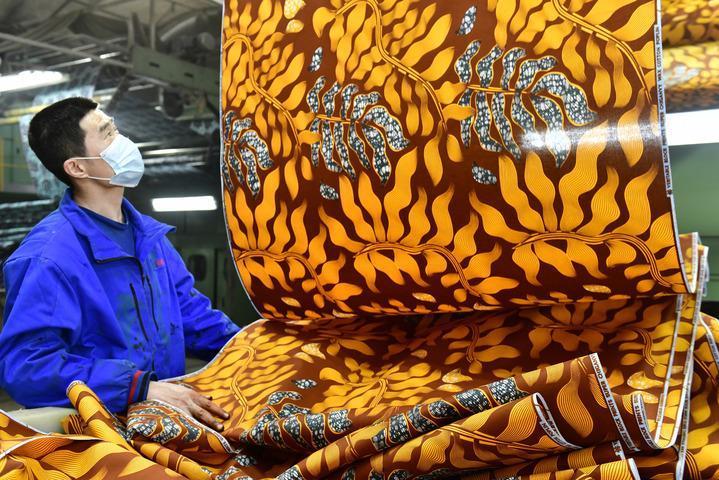 2025年2月25日,在位于山东省滨州市的愉悦家纺有限公司,工作人员在生产出口非洲的布匹。新华社记者 郭绪雷 摄