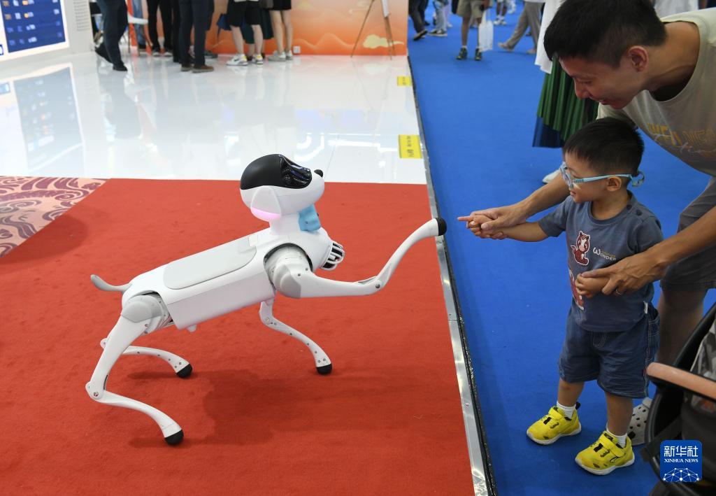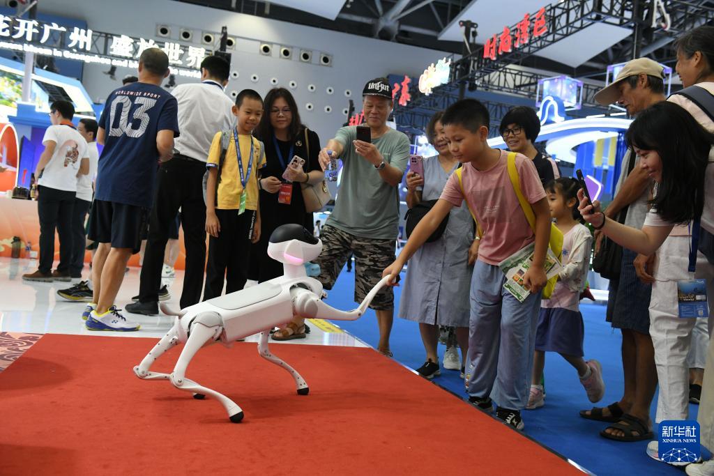 9月13日,在2025广东国际旅游产业博览会现场,观众与萌宠机器狗互动。