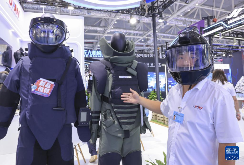 9月16日,在第二届公共安全科技装备展现场,工作人员介绍新款排爆服。