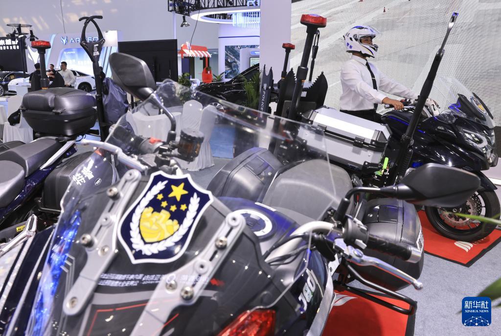 9月16日,在第二届公共安全科技装备展现场,工作人员展示警用摩托车。