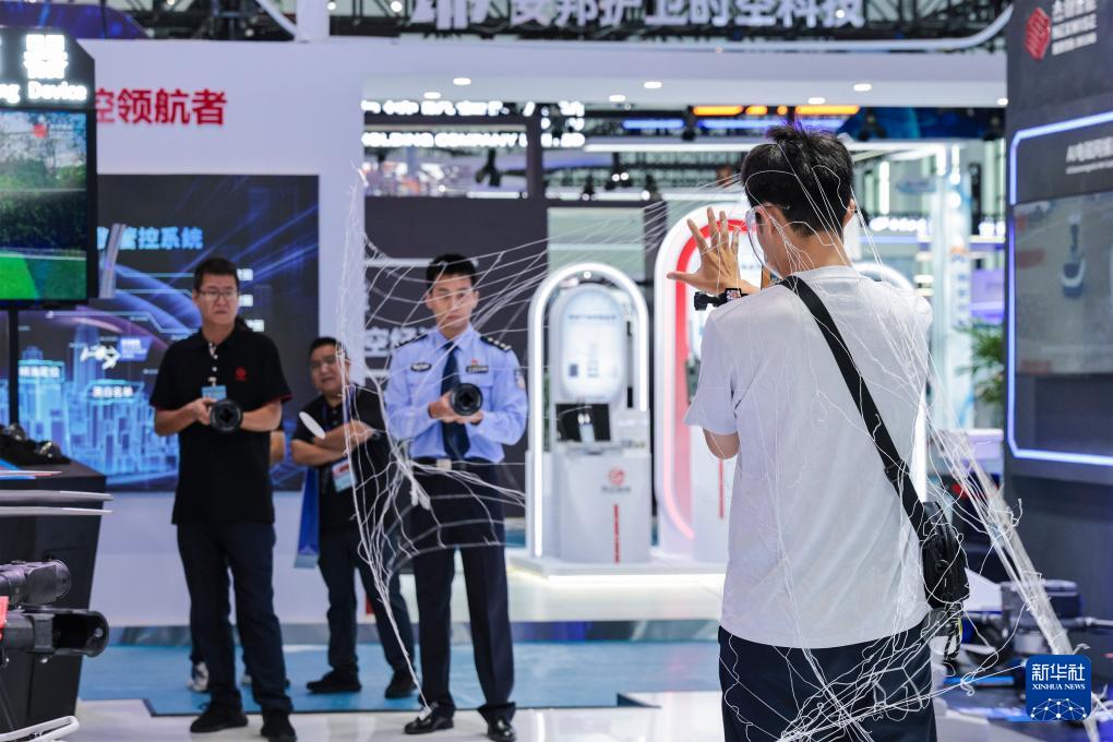 9月16日,在第二届公共安全科技装备展现场,工作人员在展示AI电磁网捕产品。