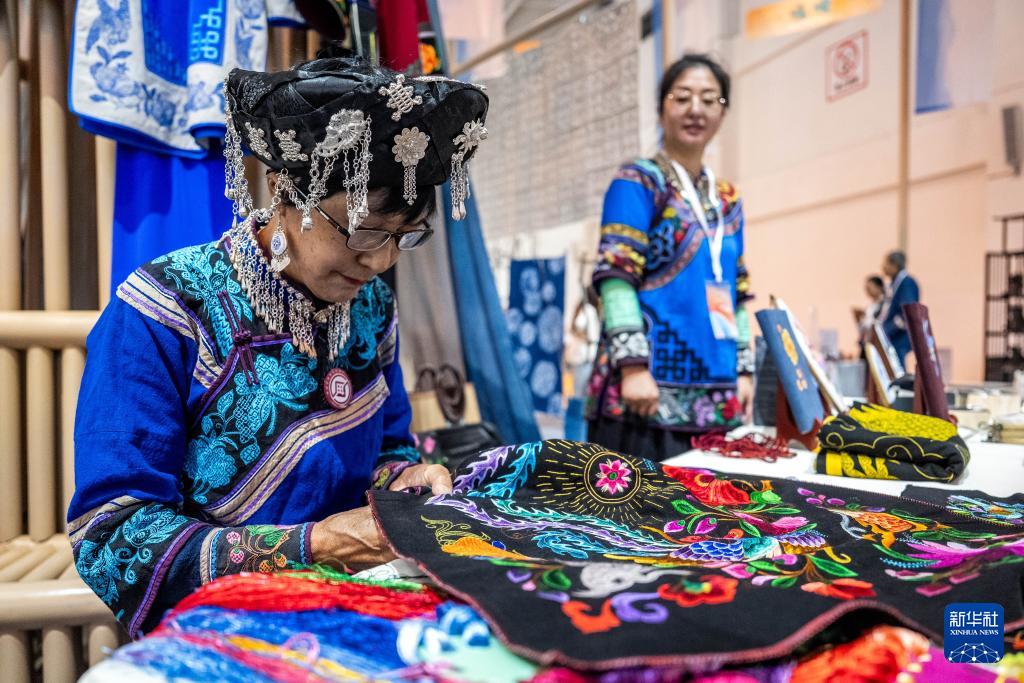 9月17日,国家级非物质文化遗产彝族(撒尼)刺绣省级代表性传承人游定美在创意云南文化产业博览会上刺绣。