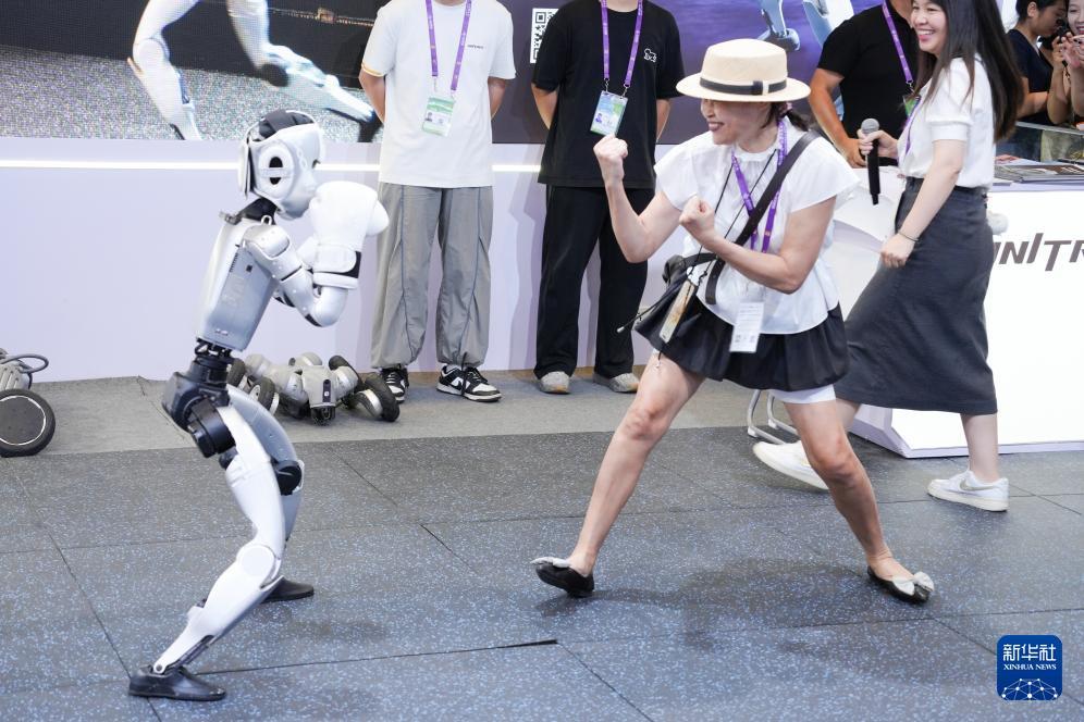9月19日,在南宁国际会展中心人工智能专馆,一台人形机器人表演“拳击”,与观众互动。