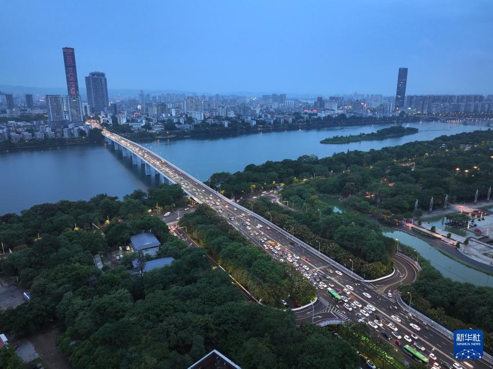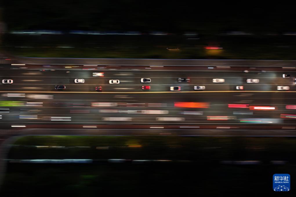 汽车行驶在广西柳州市文昌大桥上,其中部分为柳州产的新能源汽车(9月8日摄,无人机照片)。