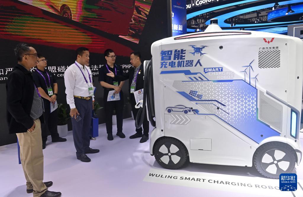 在广西南宁国际会展中心,参观者了解一款柳州产的智能充电机器人(9月19日摄)。