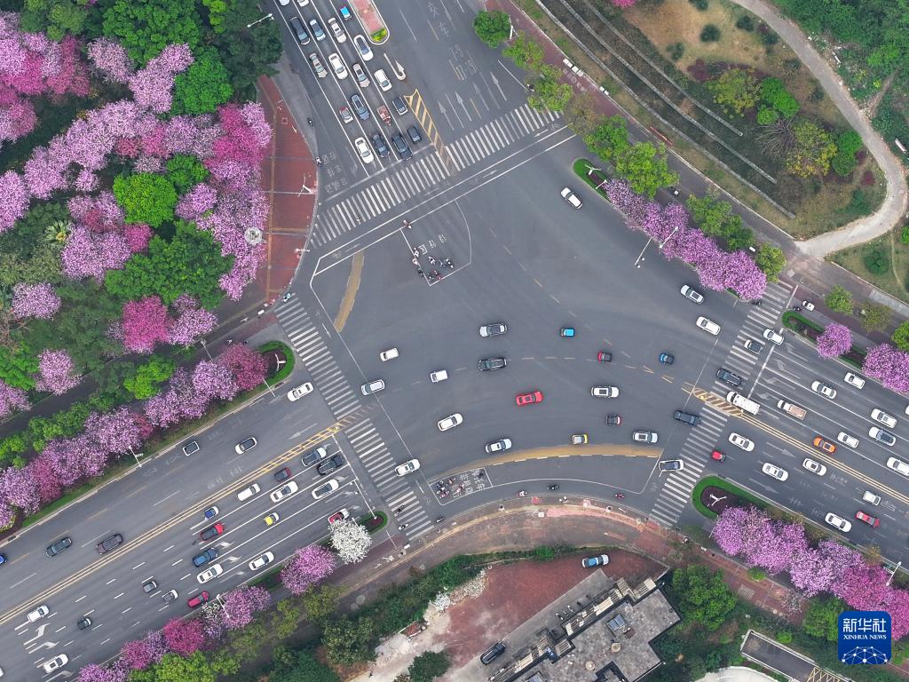 汽车行驶在广西柳州市学院路上,其中部分为柳州产的新能源汽车(4月8日摄,无人机照片)。