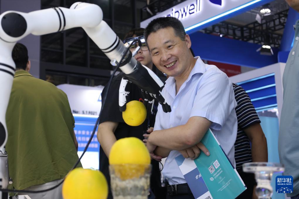 9月23日,参观者在一个进行抓取动作演示的机器手展品前驻足观看。