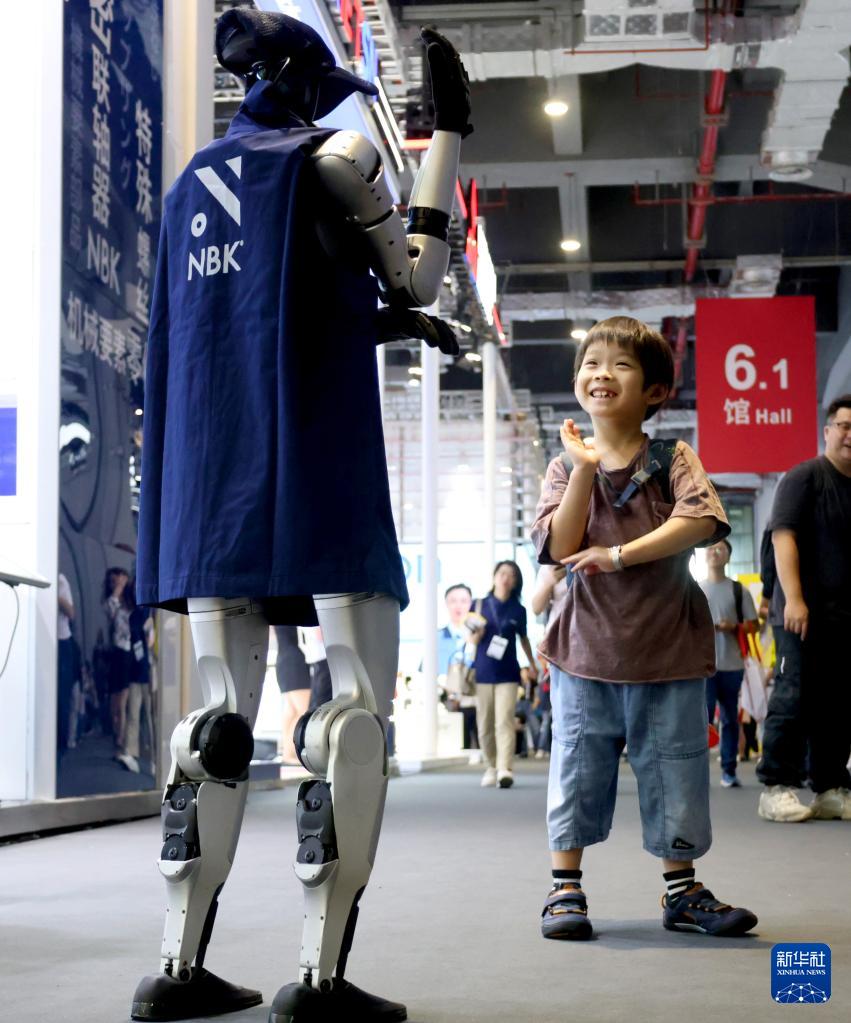 9月23日,小朋友在展会现场与人形机器人互动。