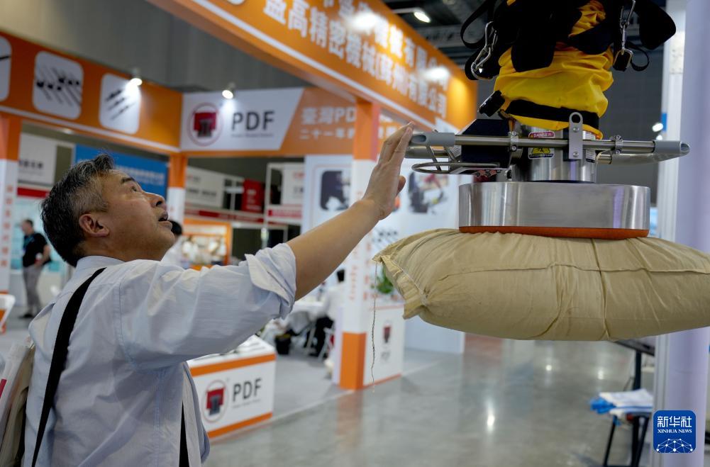 9月23日,参观者在一个重物搬运辅助设备旁驻足观看。