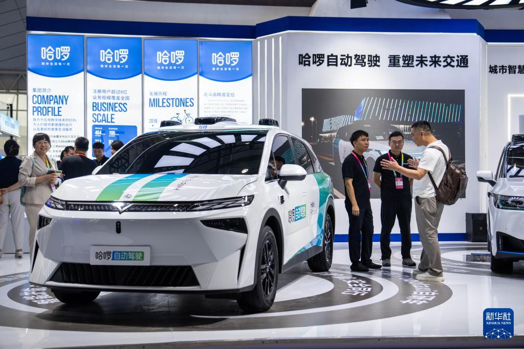 9月24日,在株洲国际会展中心,观众(右一)在了解一台配有北斗技术的自动驾驶汽车。