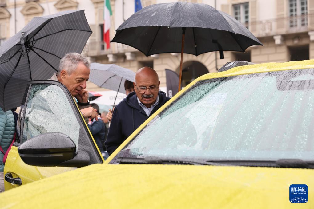 9月26日,在意大利都灵,人们在2025年都灵车展上参观一款展出的菲亚特汽车。