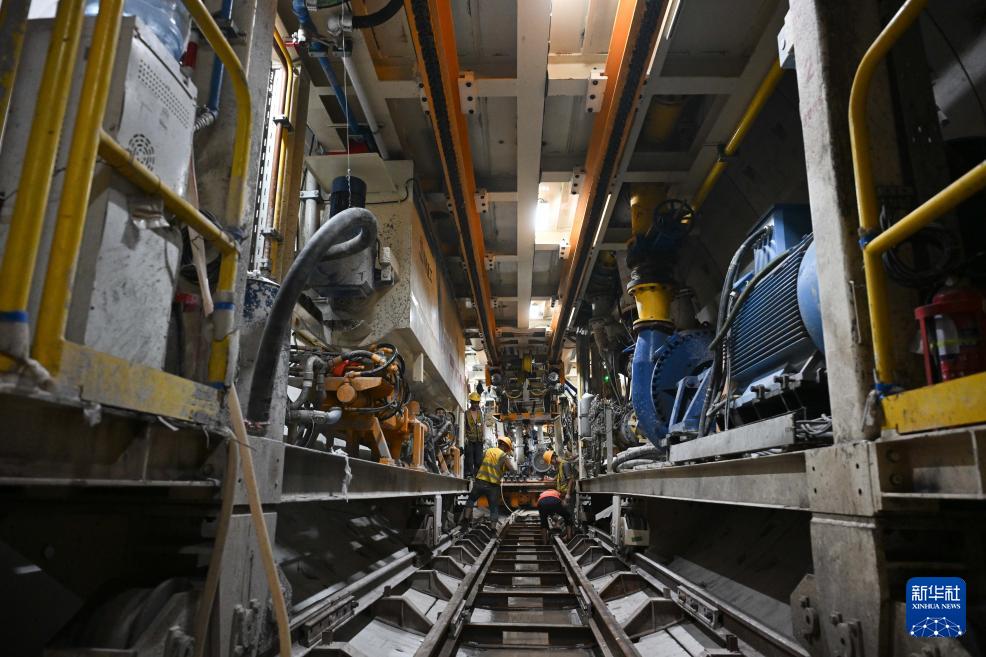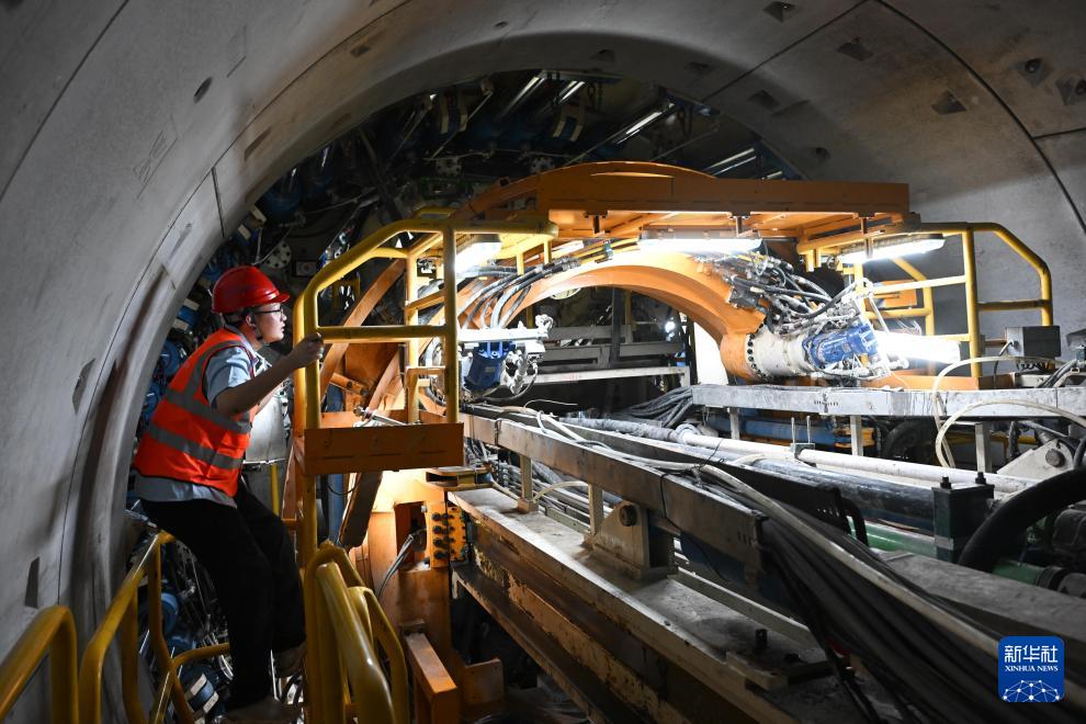 9月28日,在广东廉江的环北部湾广东水资源配置工程盾构隧洞内,中铁十二局工人在查看设备。