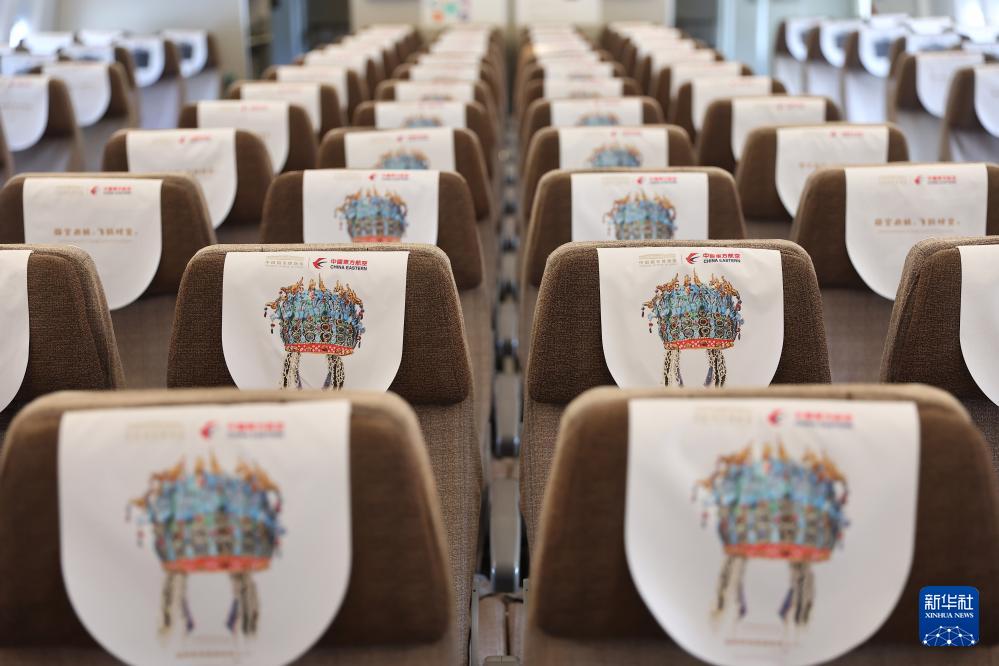 9月28日拍摄的“国博号”彩绘主题飞机上凤冠图案的头枕巾。