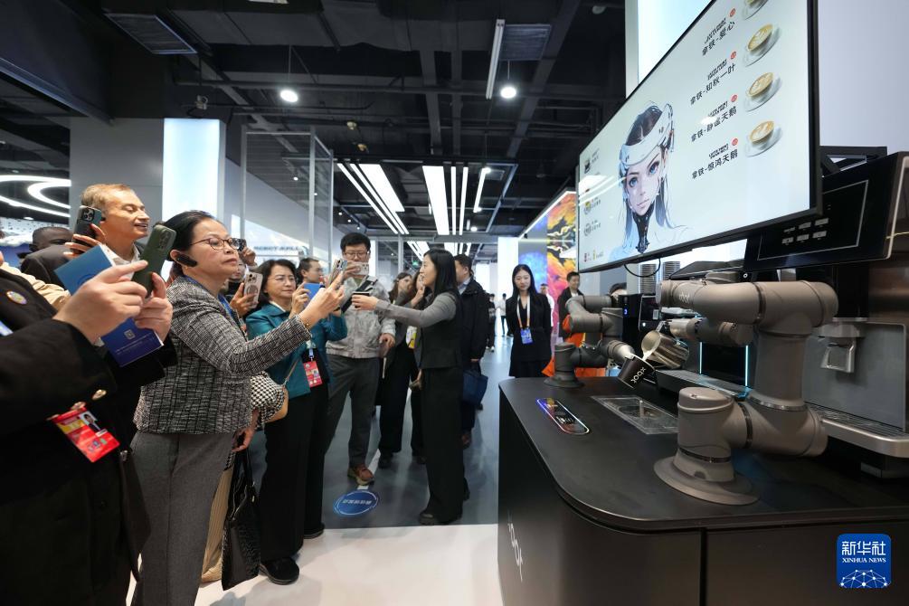 10月14日,嘉宾在北京经开区机器人大世界观看咖啡机器人演示。