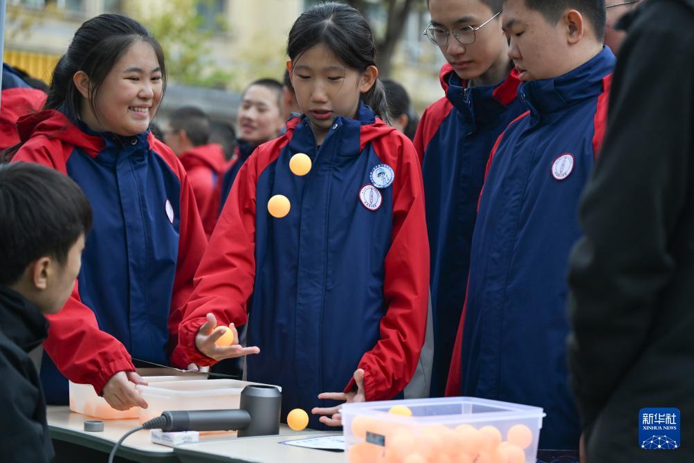 10月13日,新疆生产建设兵团第一中学学生在科技节开幕式上体验科学实验。