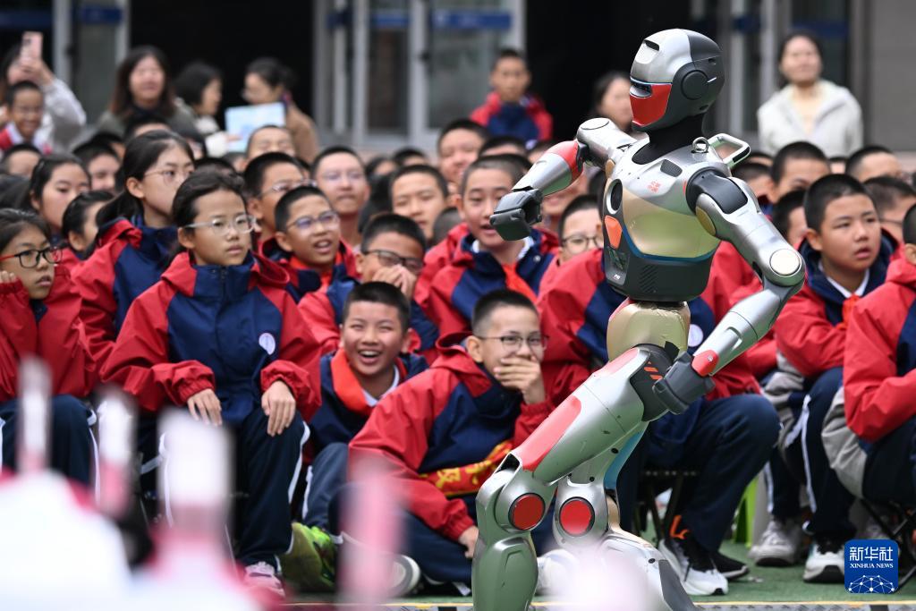 10月14日,新疆生产建设兵团第一中学学生观看智能机器狗进行复杂运动。