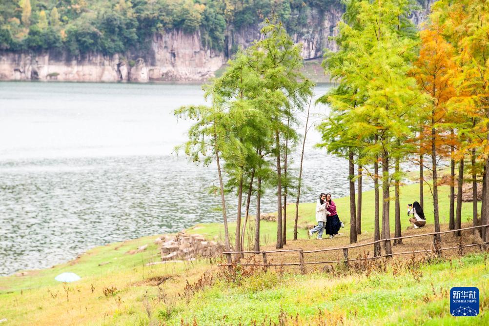 10月15日,游客在湿地公园湖畔拍照打卡留影。