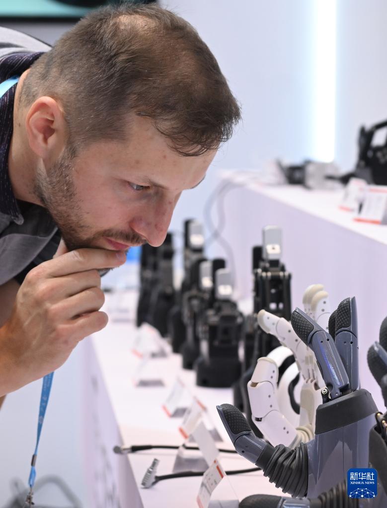10月15日,境外采购商在第138届广交会服务机器人专区观看机器手产品。