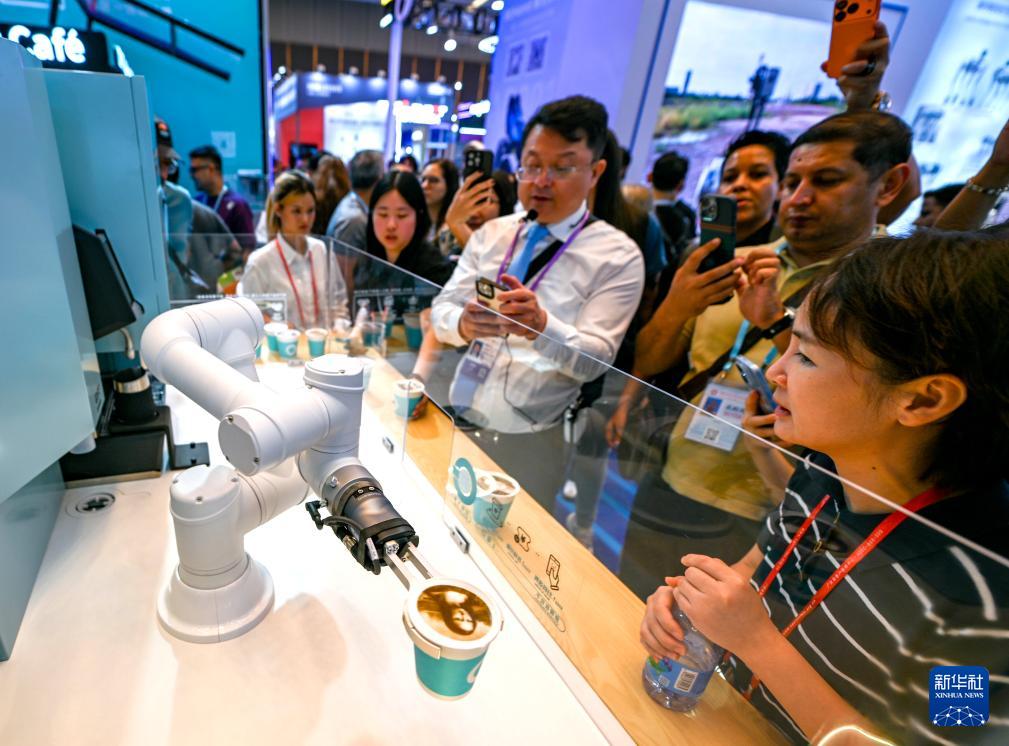 10月15日,在第138届广交会服务机器人专区,展商向观众展示一款商用咖啡机器人设备。