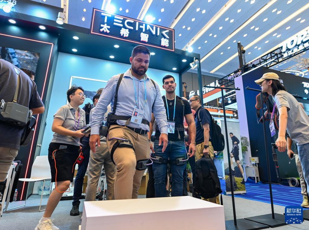 10月15日,境外采购商在第138届广交会服务机器人专区太希智能展台体验登山助行外骨骼穿戴设备。