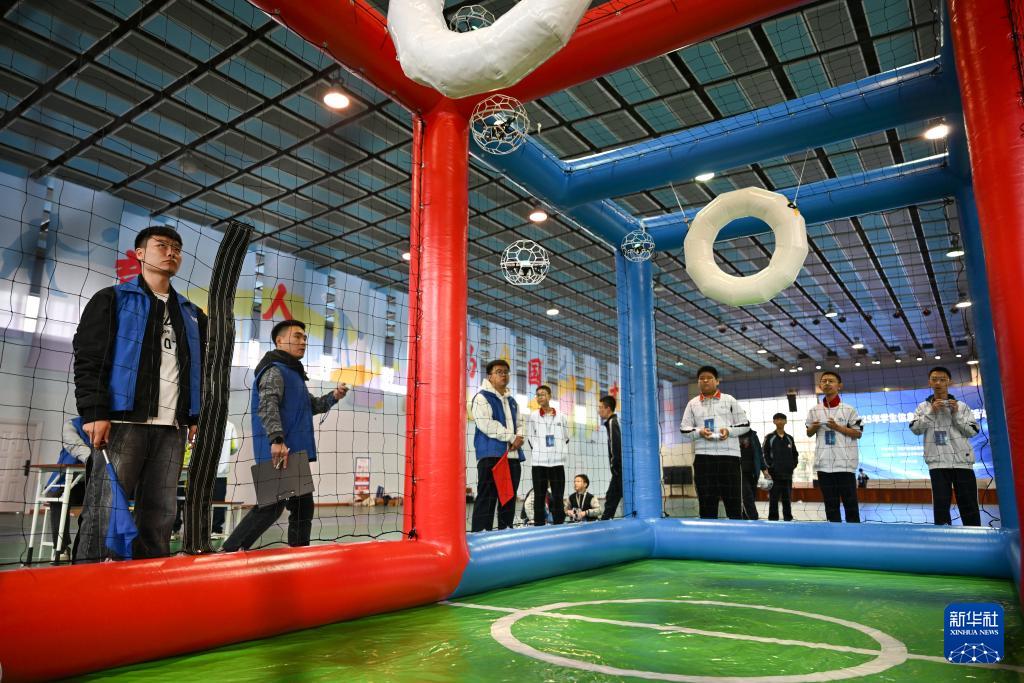10月18日,学生在西安市新城区太华路小学参加多轴无人机足球对抗赛。