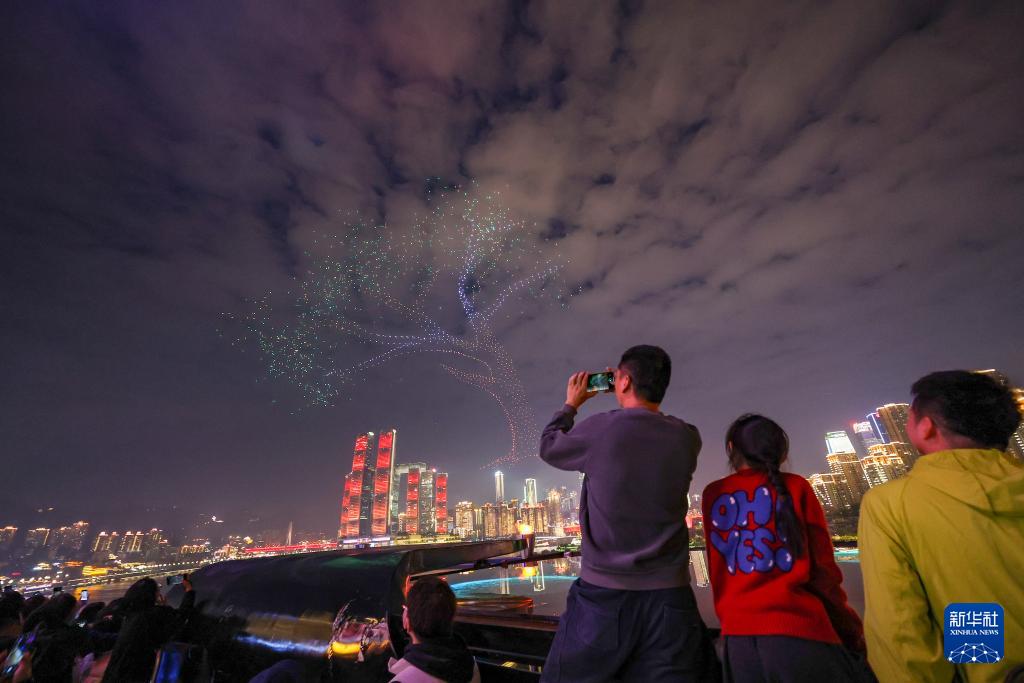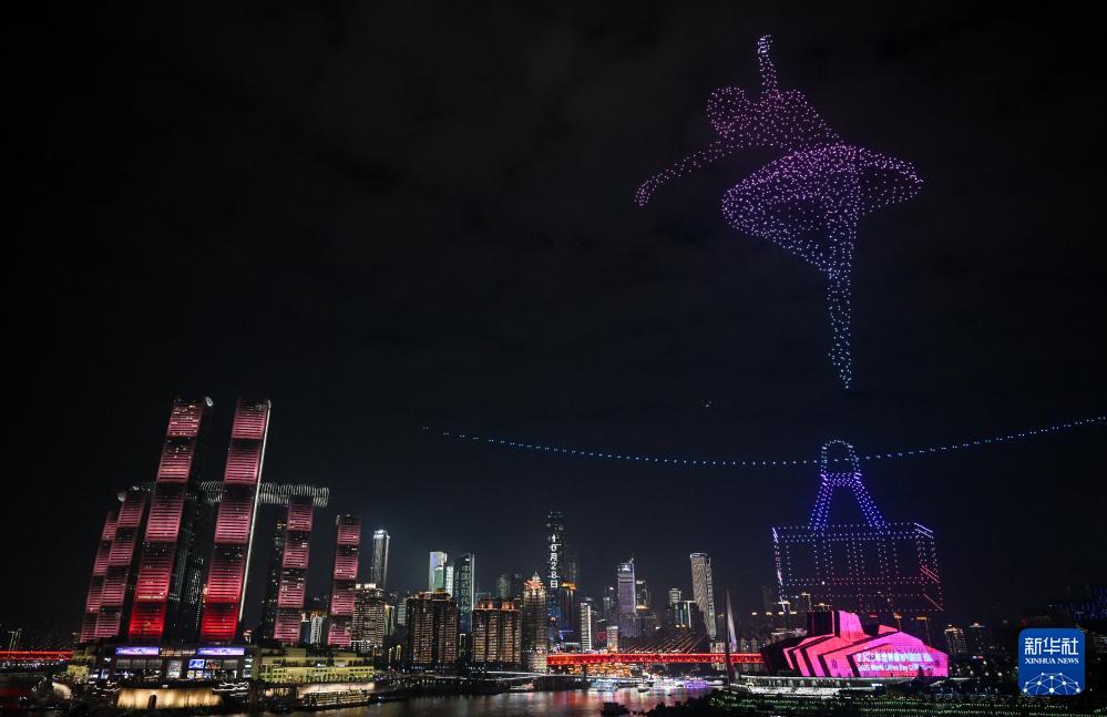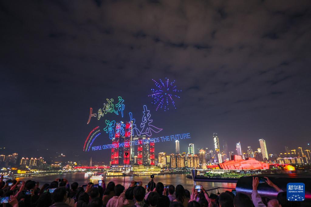 10月27日晚,“新韵重庆”无人机灯光秀举行世界城市日专场表演活动,数千架无人机以“人民城市 智绘未来”为主题,在重庆夜空勾勒出智慧与温情交织的城市图景。