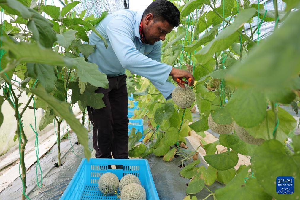 11月3日,在文莱斯里巴加湾市郊一处农业科技产业园,工作人员采摘通过中国沙培技术种植的蜜瓜。