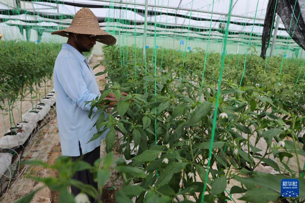 11月3日,在文莱斯里巴加湾市郊一处农业科技产业园,工作人员查看辣椒的生长情况。