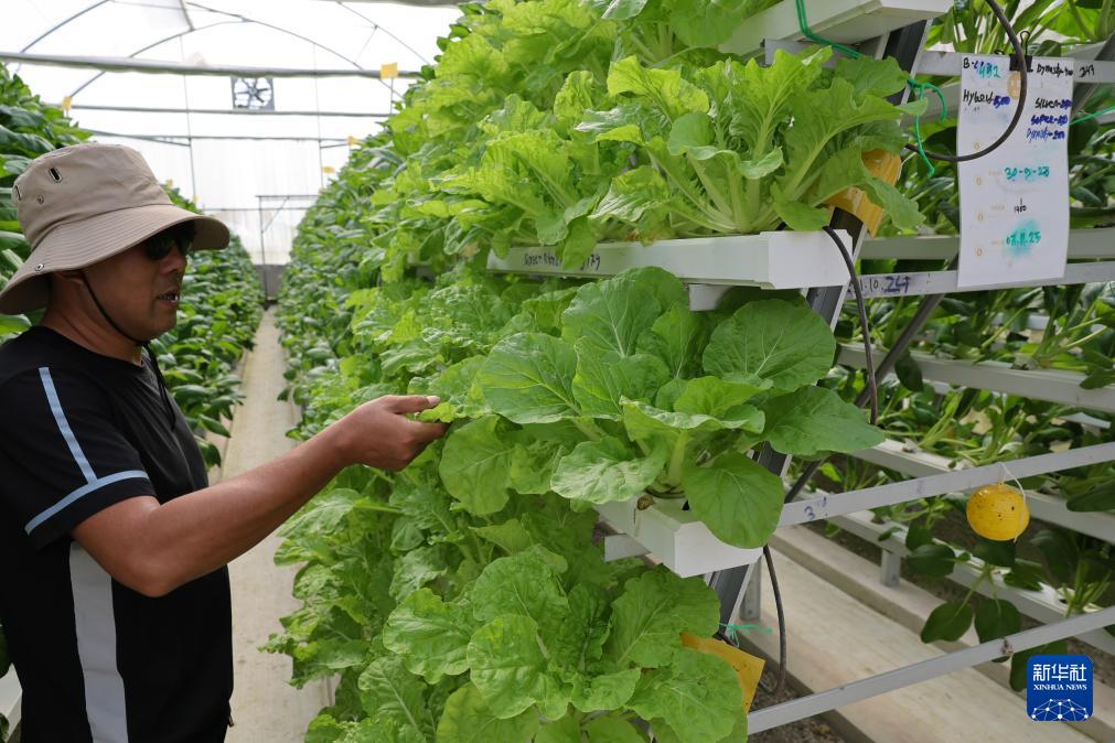 11月3日,在文莱斯里巴加湾市郊一处农业科技产业园,来自中国宁夏回族自治区固原市的农业技术专家李继华查看用水培技术种植的蔬菜的生长情况。
