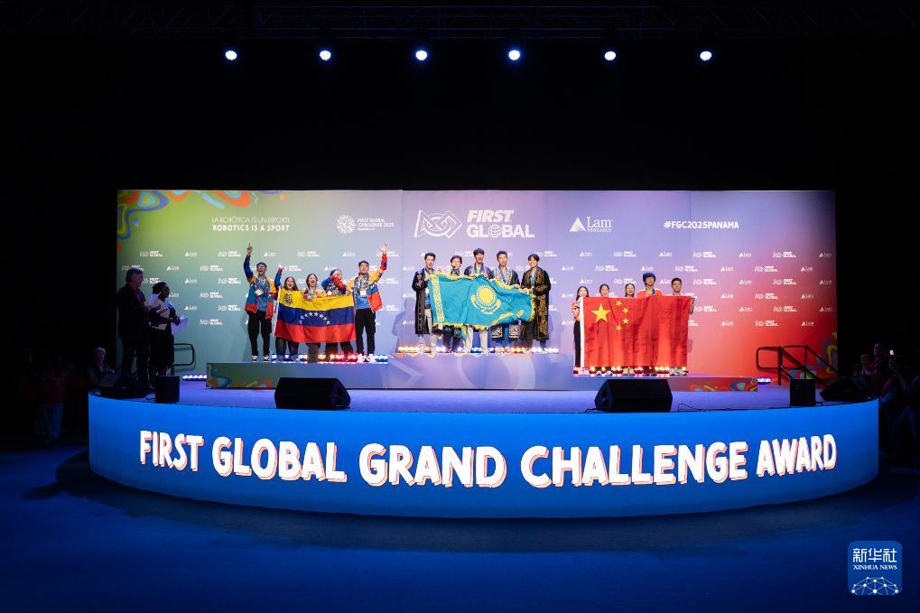 11月1日,在巴拿马首都巴拿马城,中国队队员在2025年FIRST全球机器人挑战赛领奖台上领奖。