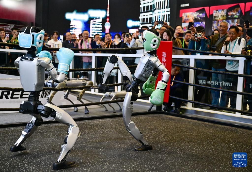11月6日,在第八届进博会技术装备展区宇树科技展台,两台G1人形机器人的格斗表演吸引了众多观众。它们戴着护具及拳套,施展直拳、勾拳、左右鞭腿,展示倒地自主起身等复杂动作,不时赢得观众喝彩。据介绍,这款亮相表演的人形机器人身高132厘米,体重约35公斤。