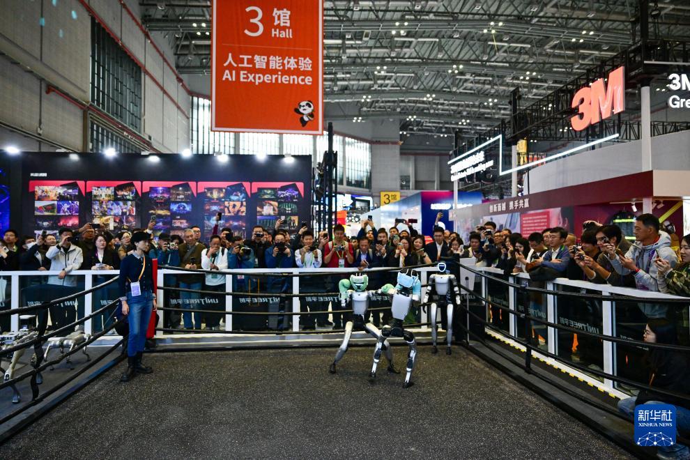 11月6日,在第八届进博会宇树科技展台,人形机器人进行格斗表演。