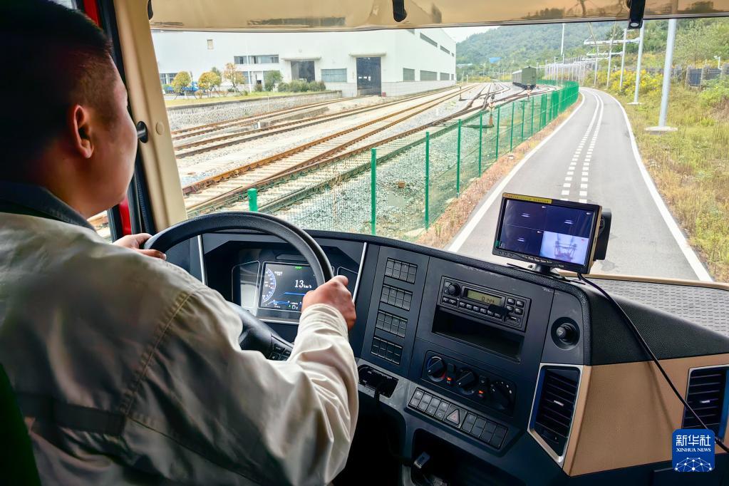 10月21日,在中车株机公司电气化公路试验线,工作人员在驾驶测试一辆电气化公路重卡。