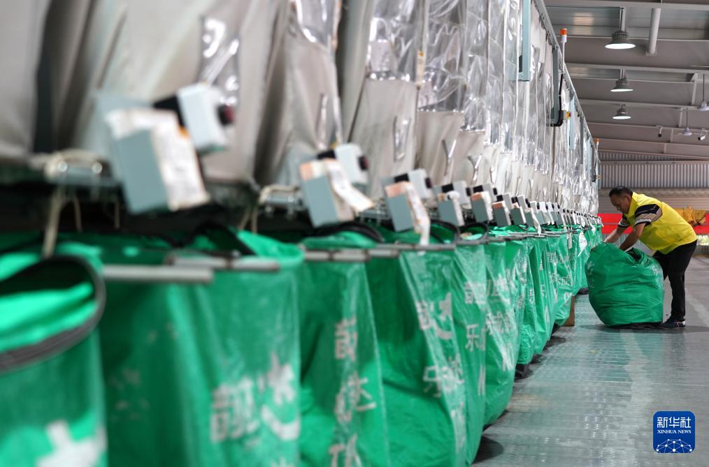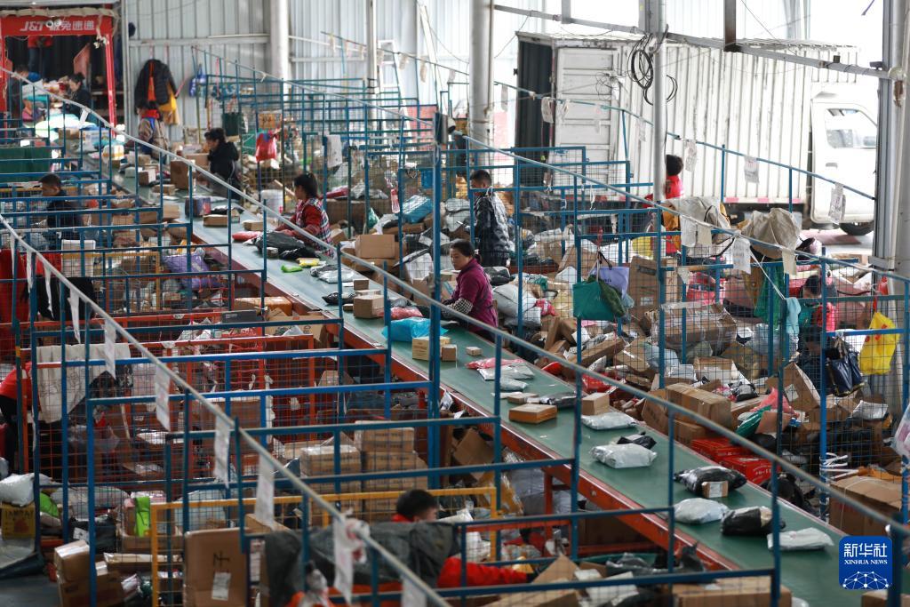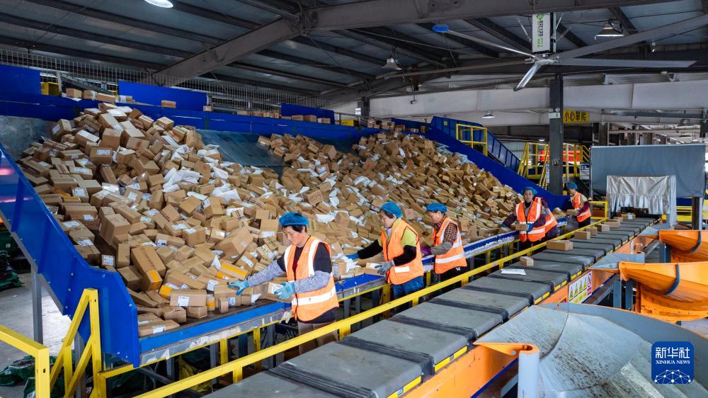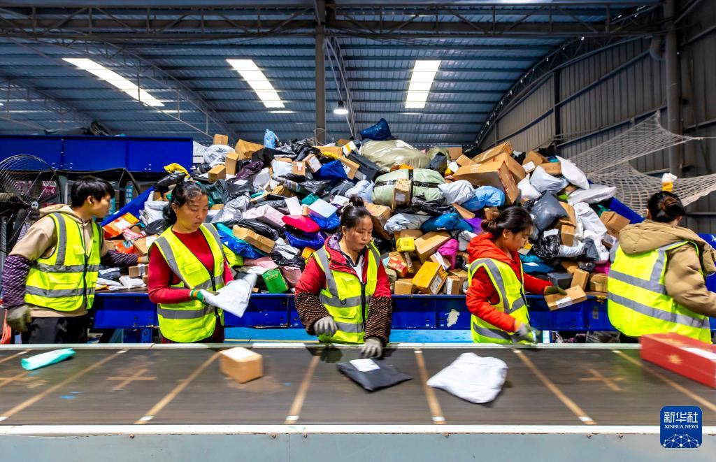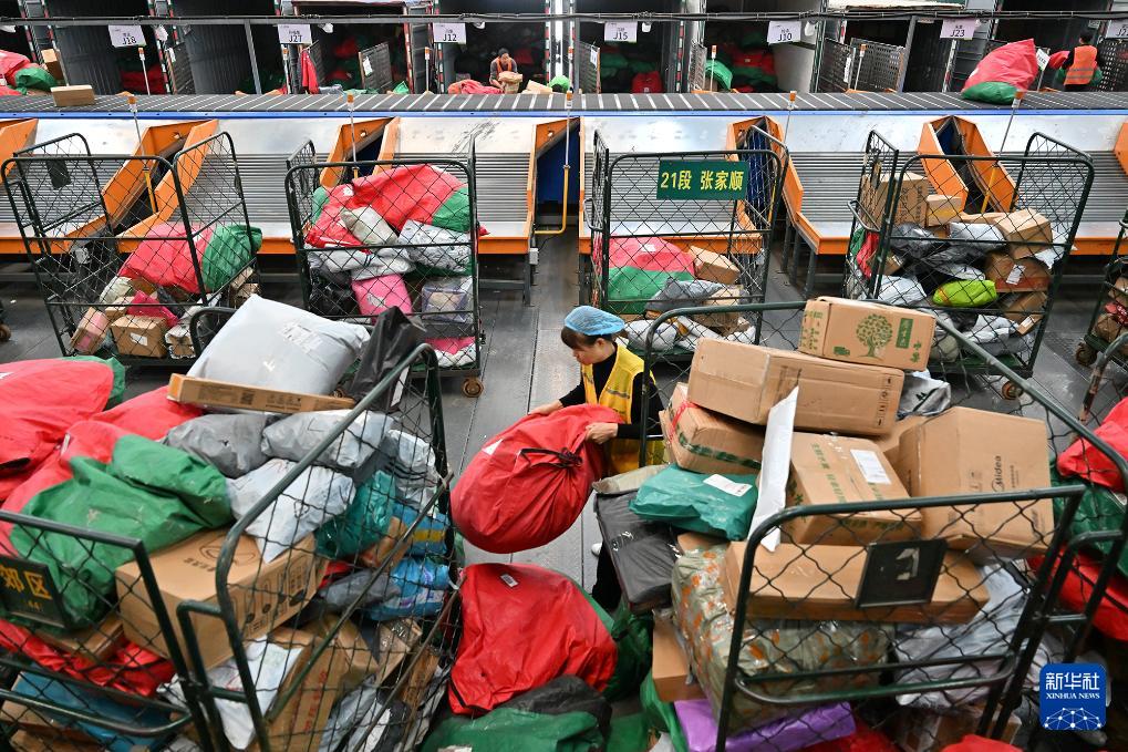 11月10日,工作人员在贵州省黔南布依族苗族自治州都匀市电商快递物流园分拣包裹。